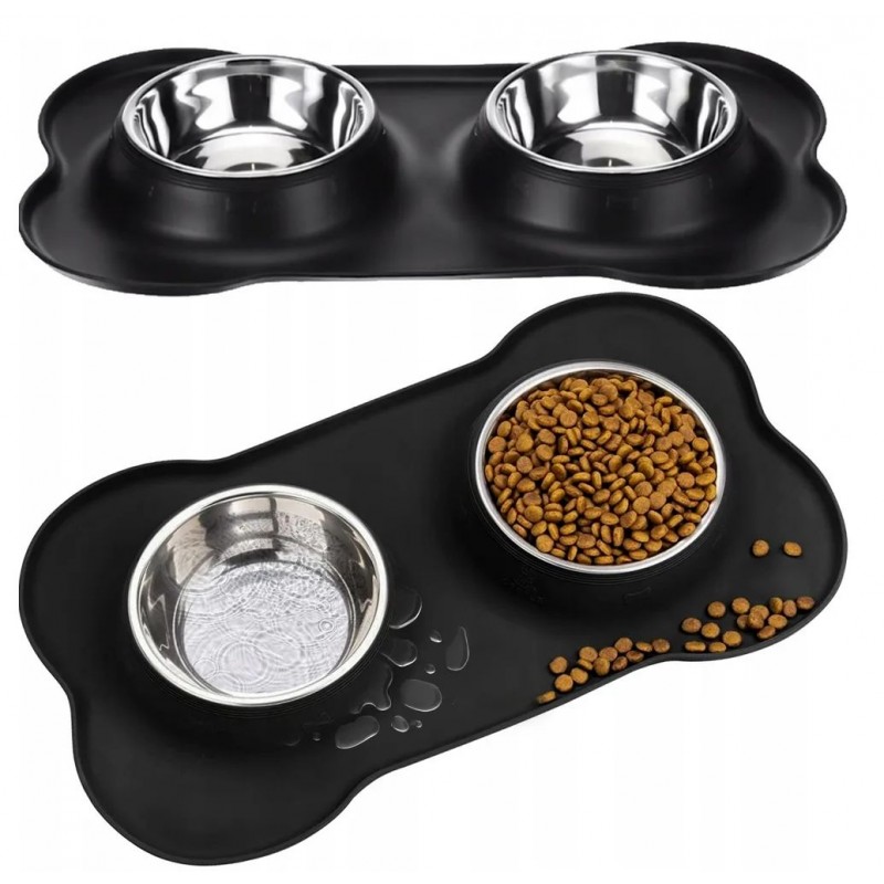 Miski są umiejscowione w silikonowej podstawce. Oddzielona konstrukcja podstawy i misek pozwala na łatwe wyczyszczenie zestawu. Miseczki wykonane są ze stali nierdzewnej, dzięki czemu jest możliwość mycia ich w zmywarce.